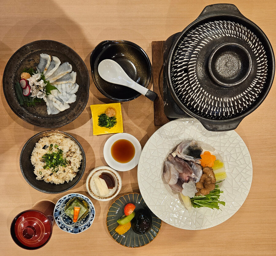 ふぐ膳(とらふぐ):ふぐ炙り造り、ふぐ鍋、 ふぐ炊き込みご飯、小鉢、赤出汁、香の物、水菓子